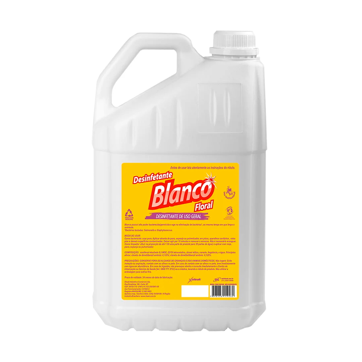 O Desinfetante Oleak Blanco Floral possui alto poder bactericida/germicida e age na eliminação de bacterias, ao mesmo tempo em que limpa o ambiante. Tenha toda a eficiência e a praticidade do Blanco Desinfetante na versão Pronto Uso. Basta aplicar o produto diretamente da embalagem na superfície que necessita ser desinfetada. Como não precisa diluir, é muito versátil e ideal para ter sempre à mão. Blanco Desinfetante pode ser usado em todos os locais onde são necessárias limpeza e desinfecção eficientes. O desinfetante possui em sua composição a combinação sinérgica de dois quaternários de amônio na versão 5L. Blanco Desinfetante 5L rende até 150 litros e está disponível com as opções de fragrância Floral e Lavanda.